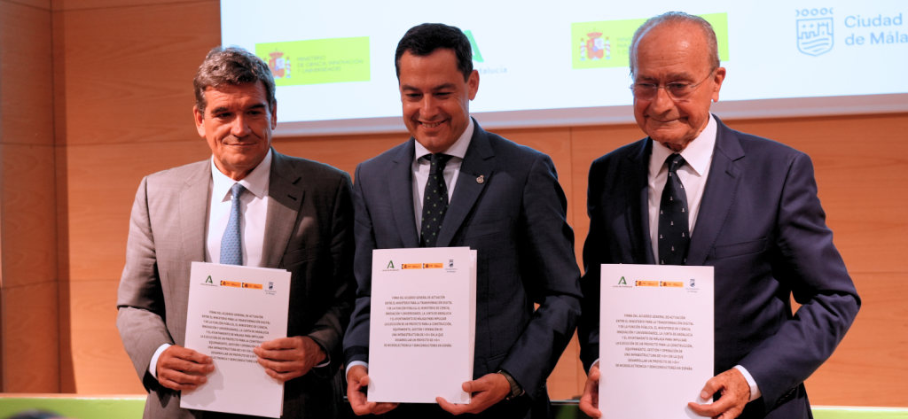 El Gobierno de España, a través de los Ministerios para la Transformación Digital y de la Función Pública y de Ciencia, Innovación y Universidades; la Junta de Andalucía y el Ayuntamiento de Málaga han firmado un acuerdo de colaboración que permitirá la puesta en marcha de un centro de innovación de chips en obleas de 300 mm de IMEC en el Parque Tecnológico de Andalucía. El acto de firma ha tenido lugar en la tarde de este martes con la asistencia del ministro para la Transformación Digital y de la Función Pública, José Luis Escrivá, el presidente de la Junta de Andalucía, Juanma Moreno, y el alcalde de Málaga, Francisco de la Torre.