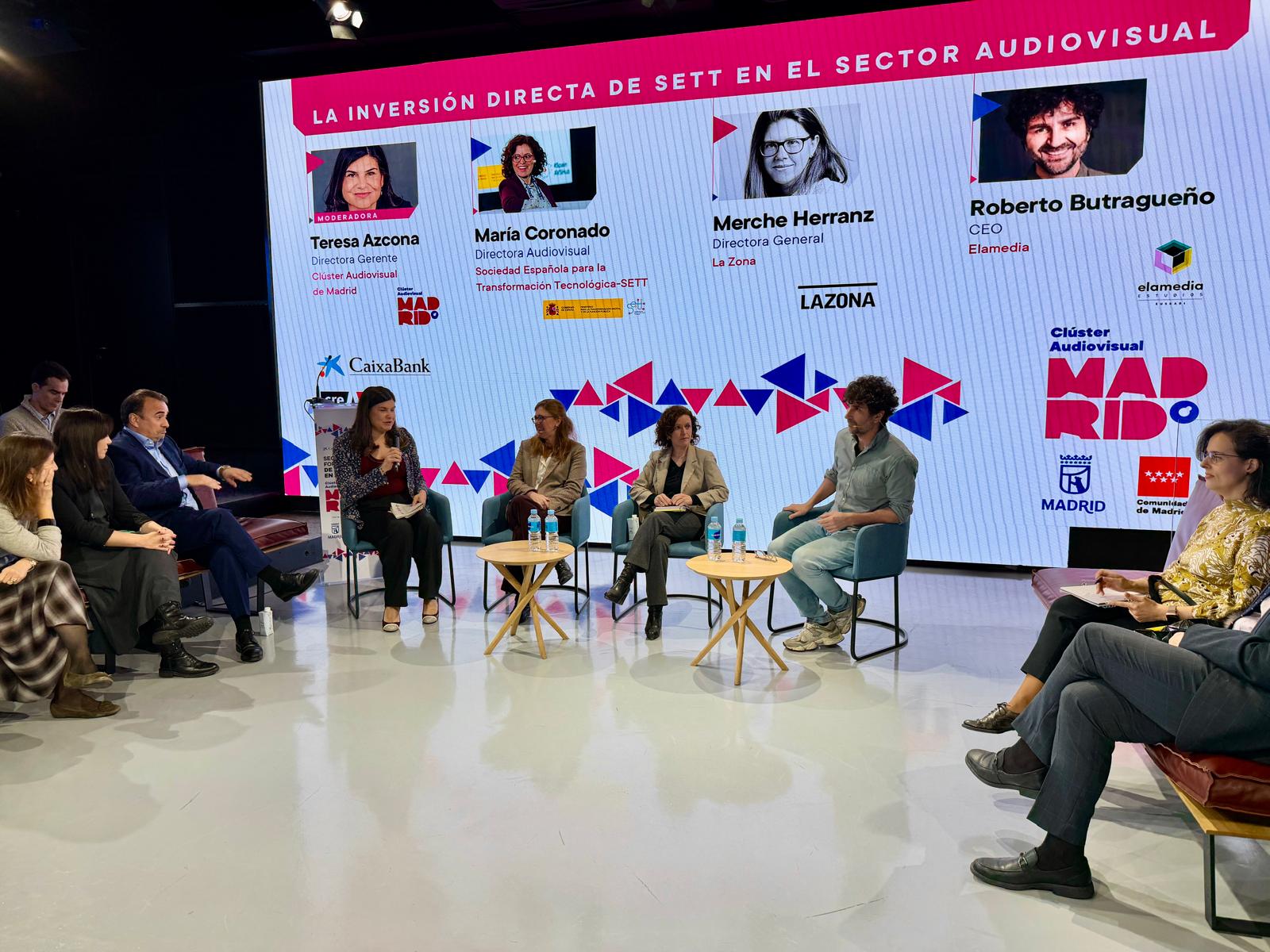 A continuación, Teresa, Azcona, directora gerente del Clúster Audiovisual de Madrid, ha moderado la segunda mesa en torno a la SETT, en este caso enfocada a la inversión directa. María Coronado ha dado detalles del funcionamiento de esta alternativa, junto con Merche Herranz, directora general de La Zona, y Roberto Butragueño, CEO de Elamedia, los más recientes socios de las inversiones directas de la SETT en esta industria. “Este proyecto es un claro ejemplo de cómo la colaboración público-privada puede reforzar que se diversifiquen y se escalen las iniciativas. Hacemos que el proyecto crezca. Somos un acelerador de proyectos”, ha explicado Coronado.