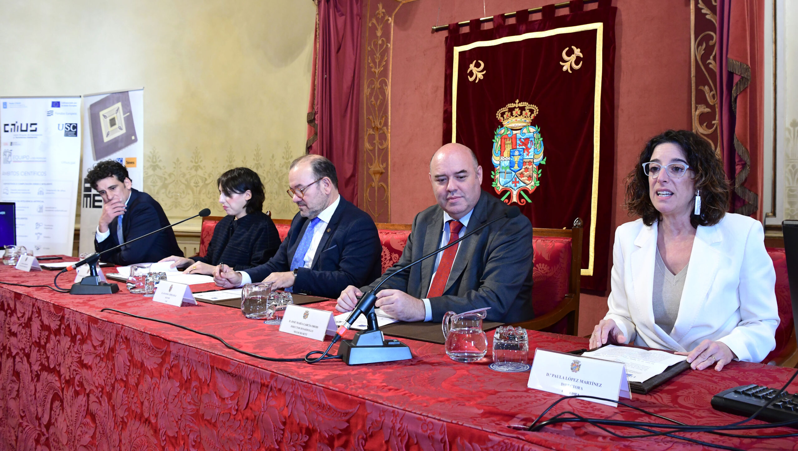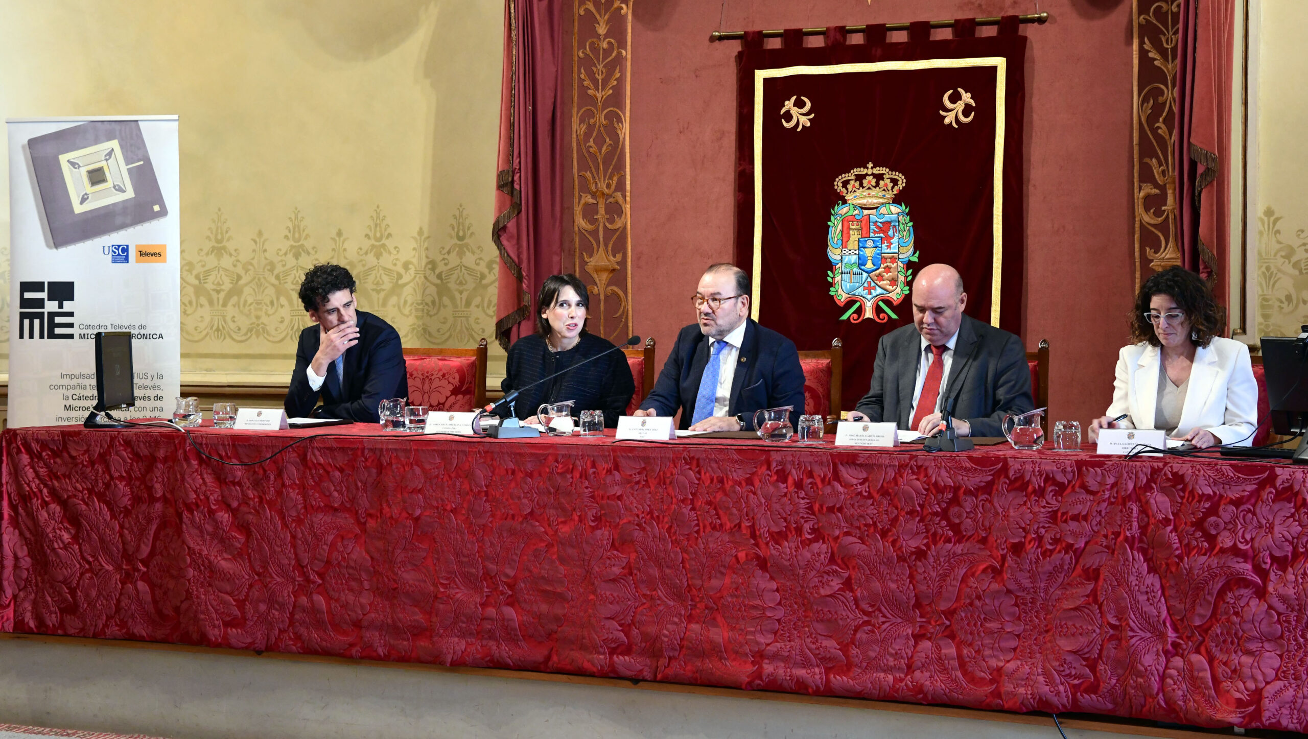 El acto congregó a diferentes representantes del sector público y privado: por un parte, los responsables de ejecución del proyecto: la propia Paula López y el director ejecutivo (CEO) de la Corporación Televés, Gonzalo Redondo. Por otra, el rector de la USC, Antonio López, que actuó como anfitrión de esta presentación; José María García Orois, director de Desarrollo de Negocio de la Sociedad Española para la Transformación Tecnológica (SETT); y María Jesús Lorenzana, Conselleira de Economía e Industria de la Xunta de Galicia -entre otros representantes del ecosistema científico y tecnológico gallego-.